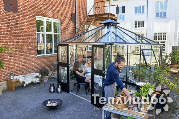 В комплект входит каркас теплицы Juliana Oasis Aluminium площадью 8,8 м² из полированного алюминия, закаленное стекло толщиной 4 мм., 2 форточки в торцах, двойная распашная дверь в торце.
